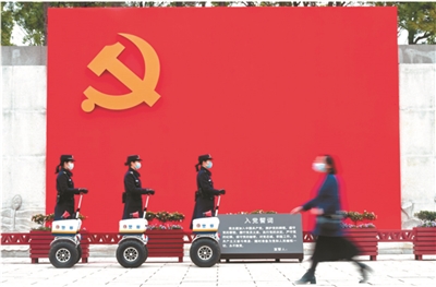| 七一派出所女子巡逻队驾驶着单警平衡车在南湖革命纪念馆宣誓墙前巡查。女子巡逻队成立于2019年10月,主要承担日常巡逻、身份核录、志愿服务等工作。 |