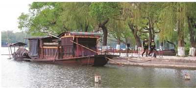 8时20分,随着第一班游船到达湖心岛,值守红船守护岗白班的民、辅警便开始了一天中最为紧张忙碌的时刻。目前,日平均客流量约为4000人次,周末客流量最高时能达到8000人次。据了解,随着建党100周年的临近,客流量还会逐步增加。执勤民警除了进行点位巡查、维护现场秩序、提醒注意事项外,还为群众提供党旗国旗借用、医疗急救、物品打捞等便民服务。笔者在现场看到,时间还不到10时,红船周边已人头攒动,有集体组织主题党日活动的,有学校组织参观学习的,有从祖国各地前来参观的……游客虽多,但秩序井然,大家都有一个共同的心愿,就是想看看红船、感受“红船精神”。