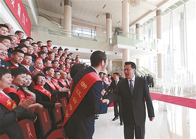 | 袁家军、郑栅洁等省领导亲切接见劳模先进、工匠代表。记者邹伟锋 摄 |