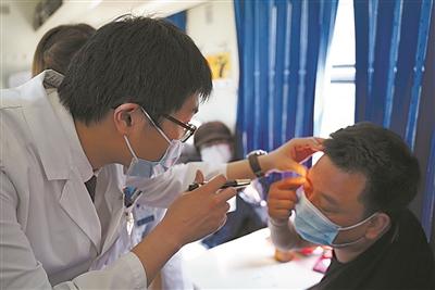 | 姚玉峰劳模团队成员为旅客检查眼睛。 |