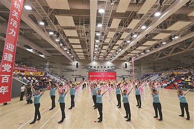 以此次举办第十三届运动会和组团参加省第四届体育大会为载体,省直机关将进一步深化“双百引领”活动,突出浙江“红色根脉”文化特色,更好地推动习近平新时代中国特色社会主义思想走近职工身边、走进职工心里。图为广播操比赛现场。