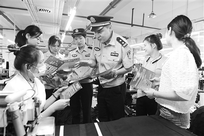 近日,东阳市公安局联合银行业金融机构和三电企业(电力、电信、广播电视),在全市范围内集中开展“三电设施安全保护和防范通信网络诈骗”宣传活动。图为东阳市公安局白云派出所民警深入企业车间,向员工开展“三电”和反诈知识宣传。