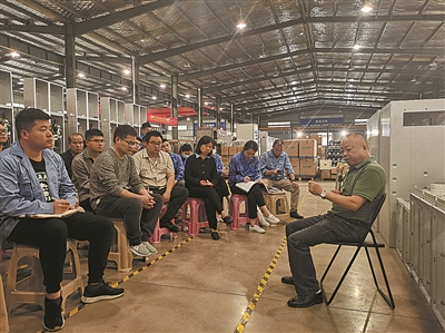 | 叶金龙(右一)与企业技术工人座谈交流。记者曾晨路 摄 |