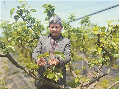 | 施泽彬查看梨新品种“翠玉”果实生长情况。 |
