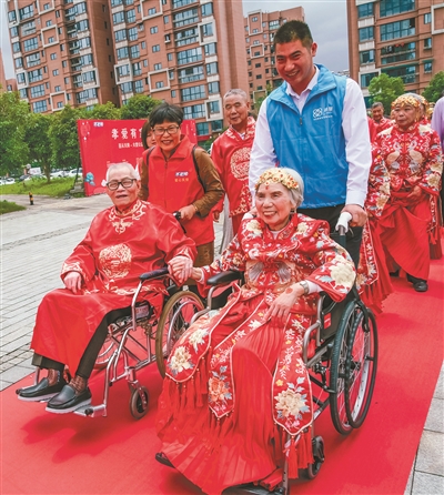 5月20日,衢州智慧新城弈谷文体广场,两家企业联手举办“孝爱有家 幸福不老 我为爸妈办婚礼”大型公益婚典。志愿者们为50对60岁以上老人“补办”传统中式婚礼。参加婚典的老人,年纪最大的已有91周岁,至今已结婚61年。图为一对耄耋老人坐着轮椅走红毯。