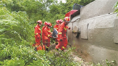 连日来,衢州地区持续降雨路面湿滑,极易引发交通事故。5月22日10时21分,衢州市衢江区廿项线草鞋岭村路段有一辆水泥罐车不慎侧翻掉入山底,驾驶员被困,情况十分紧急。接警后,衢州市消防救援支队立即调派辖区柯山消防春城路特勤站2辆消防车、10名指战员赶赴现场救援。当地交警、路政、医护等救援力量也在第一时间赶到现场协助救援。