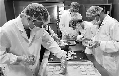 穿上工作服,接受完上岗培训,了解了车间规章制度,做好严密的杀菌消毒工作后,工会干部同一线职工一起来到生产车间,做起了干点制作、面包包装、海鲜食品加工、海鲜食品包装等工作。