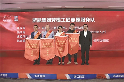 4月28日,在首届“浙能工匠节”开幕式上,浙能集团劳模工匠志愿服务队4个专业组组长从集团党委副书记、总经理詹敏手中接过队旗,宣告该集团劳模工匠志愿服务队成立。