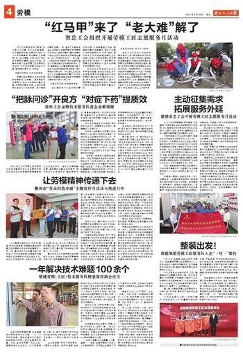 企业有难题,技术大师来帮忙。为帮助企业解决一些技术难题,金华婺城区总工会积极利用工会资源优势,把部分有专业特长的劳动模范、高级技师和工程技术人员组织起来,于2019年成立了两支分别由八婺工匠徐孝华和全国劳模陈立平担任负责人的劳模(工匠)技术服务队,为企业提供技术攻关、技术帮扶、技术培训、技术协作等服务。