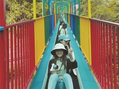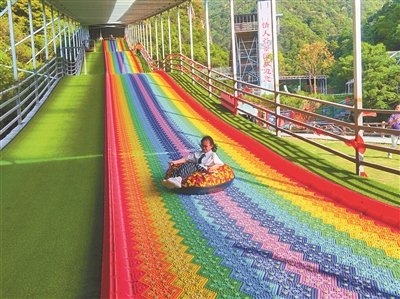 彩虹滑道,分为两个滑道,全长131.4米,宽9米,采用高架凌空的设计,带来刺激体验的同时,也能保证安全,游客从色彩斑斓的滑道顶端开始急驰,无论大人还是小孩,都能分分钟爱上。