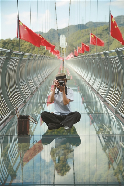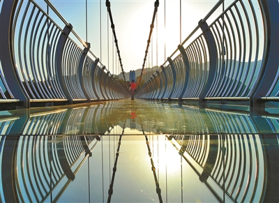 清晨,烟雾弥漫着远山,让牛郎峰、织女峰穿上了洁白的纱裙,两座大山横卧着一座“12D玻璃景观悬索桥”,站在桥上,好似仙境一般。雨雾散去,牛郎峰、织女峰又恢复了真实的样子,远看“12D玻璃景观悬索桥”颇为壮观。走进潘家小镇,一幢幢仿明清建筑的水坊风情街,又仿若置身于山水画之中。
