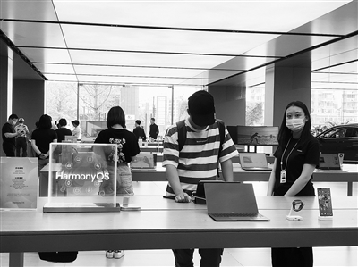 | 客户在杭州黄龙万科华为智能生活馆体验内体验鸿蒙操作系统。 许瑞英 摄 |
