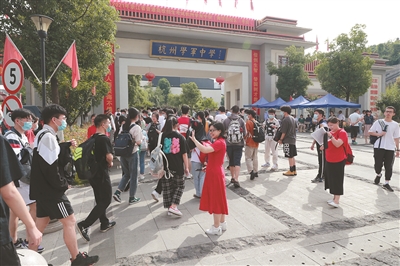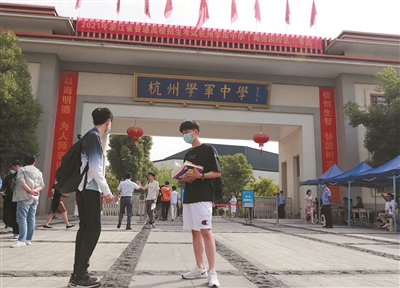 | 图为在杭州学军中学(海创园校区)考点,考生们有序进入考场,老师向每一位学生挥手加油。 |