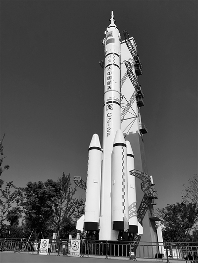 科技馆外,有一座由中国航天局建造的火箭实体模型,整个火箭实体模型重量约3.5吨,长17.346米,翼展3.19米,最大直径3.2米,推进器长4.67米,直径0.67米。该模型以“长征二号运载火箭”为原型,以1∶3的比例制作,并能真正模拟点火装置。