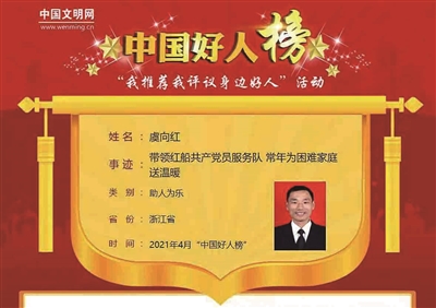 近日,中央文明办发布4月“中国好人榜”,全国共106人上榜。国网东阳市供电公司职工虞向红以“助人为乐”成功上榜。