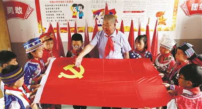 近日,在玉环市清港新民小学里,来自全国各地的少数民族学生围着党旗,聆听清港镇关工委副主任、“老陈”工作室领衔人、老党员陈志生讲述党旗、党徽的知识和故事,激发小朋友爱党、爱国豪情,喜迎建党100周年。