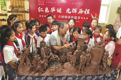 昨日,杭州建德市明珠小学陶艺课老师、工匠艺人、校外辅导员余一夫在陶艺课堂上,向学生们一边讲述自己刚创作完成的陶艺党史作品的心得体会,一边对作品作最后的精修,让学生从中知史爱党。