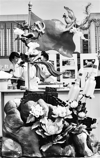 近日,在绍兴市职教成果展上,诸暨技师学院师生共创作品《腾飞 中国》惊艳全场。该作品为泡沫雕刻,由日常的白萝卜、青萝、胡萝卜、南瓜、泡沫等材料制作而成。灰褐色底座是我国标志性建筑——长城,长城上面党旗飘扬,国旗两侧龙飞凤舞,周围祥云围绕,一派祥和之气,寓示着新中国在党的领导下龙凤呈祥,国泰民安;长城四周盛开着的牡丹花,表示国富民强;两支白色升空的火箭代表我国经济、科技、军事的飞速发展。该作品无论是技艺还是寓意都获得了与会领导和现场观众的大力点赞。