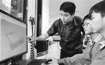 为庆祝中国共产党百年华诞,金华市技师学院学生运用本专业所学,设计制作了庆祝中国共产党成立100周年纪念浮雕、红船3D打印、系列徽章、文化衫、扎染等纪念作品。图为该校数控技术专业老师正在指导学生运用五轴精密加工中心,设计创作作品,以技能青春,献礼建党百年。