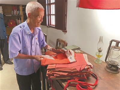 给人星火者,必怀火炬。“我从小就听长辈们说起这里曾经是红色的海洋,我希望这份红色记忆与红色基因能永远传递下去。”朱宗鹤折好今年7月1日换下的旧国旗,与其他28面国旗一起,小心翼翼地放到文件柜中。