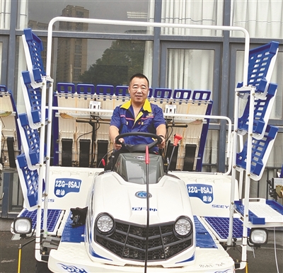 | 牟加义和他参与设计的全自动高速插秧机。 记者羊荣江 摄 |