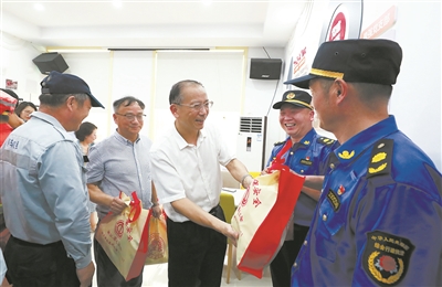 | 在杭州市上城区湖滨环卫所城管驿站,史济锡向高温坚守岗位的环卫工人、停车收费员、综合行政执法队员等送上慰问品。 记者邹伟锋 摄 |