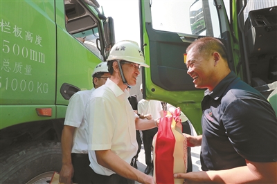| 在申嘉湖高速公路安吉孝源至唐舍段工程现场,张才方向现场施工人员、运输车辆驾驶员送上防暑降温用品。 记者邹伟锋 摄 |
