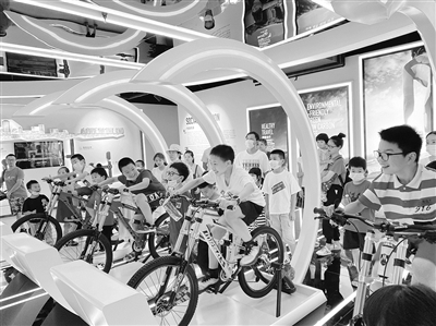 | “小候鸟”在地信科技馆里体验环保骑行。 |