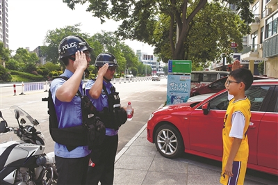 原来,小朋友名叫丁泓博,当天是他的10周岁生日,看到顶烈日、战酷暑的街面巡防辅警,就用自己的零花钱购买了矿泉水,给坚守一线的巡防辅警送上“清凉”,度过了一个最有意义的生日。