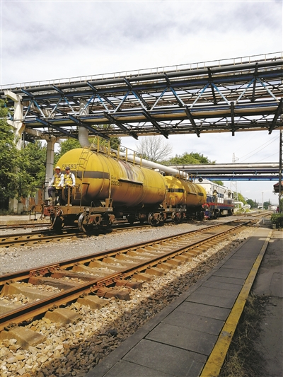 炎热的三伏天,给铁路安全运输工作带来威胁,巨化物流公司认真、严格执行作业标准化,确保运输安全。图为7月19日,调车人员正在作业中。