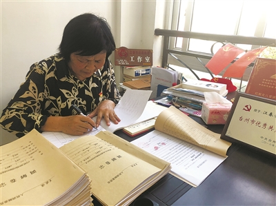 | 江春芳正在记录当天调解档案。 记者潘仙德 摄 |