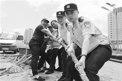 今年第6号台风“烟花”向浙闽沿海逼近。7月20日上午,台州市公安局椒江分局港区派出所组织民警深入辖区海义码头,积极做好防台风工作,帮助渔民加固渔船,提醒渔民撤离上岸,确保万无一失。通讯员何文斌 摄