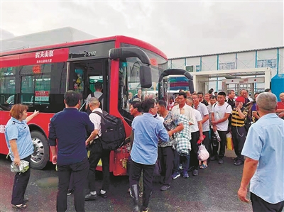 | 公交工作人员紧急转移近江附近的300名务工人员。 黄佳琪 摄 |