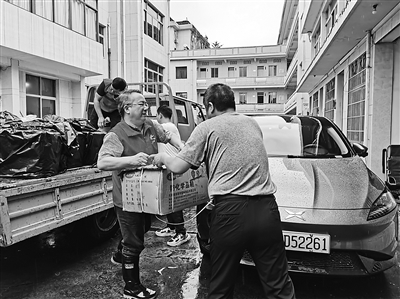 | 7月27日早上,海曙区总工会常务副主席吕维共(前排左一)得知章水镇缺少雨鞋等物资后,特地送来100双雨鞋、20套雨衣、若干充电宝等物资。 |
