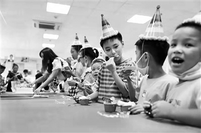 游园会还为所有“小候鸟”们准备了一场生日惊喜会。伴随着生日快乐的歌曲,父母们亲手为“小候鸟”戴上生日帽,大、小朋友一起吃蛋糕互赠祝愿,其乐融融。“这样集体的生日会还是第一次过,很有仪式感,很大程度弥补了我们家长因为工作忙不能经常陪伴孩子的遗憾。”家长刘先生称。