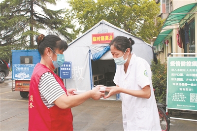 近段日子以来,桐庐县富春江中心卫生院的医务人员放弃休息,冒着高温为群众接种疫苗。图为8月3日下午,桐庐县富春江镇大洋坪社区“红巷妈妈”志愿服务队特意熬制绿豆粥,为该院医务人员送上清凉和关爱。