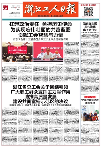 浙江省总工会第十五届委员会第五次全体会议,深入学习贯彻习近平新时代中国特色社会主义思想,学习贯彻习近平总书记“七一”重要讲话精神、关于共同富裕的重要论述,学习贯彻省委十四届九次全会精神,就全面贯彻落实《浙江高质量发展建设共同富裕示范区实施方案(2021—2025年)》作出系统部署,原则通过《浙江省总工会关于团结引领广大职工群众发挥主力军作用 助推高质量发展建设共同富裕示范区的实施方案(2021—2025年)》。