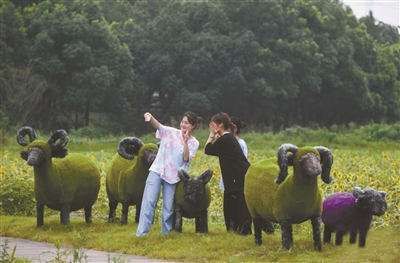 昨日,几名游客在湖州市东林镇南山村特色度假小镇的向日葵花田旁自拍留影。
