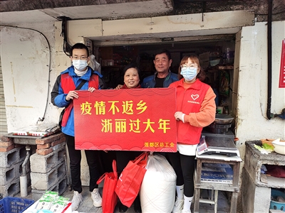 莲都劳模有力量。在新春佳节来临之际,莲都区总工会发挥劳模志愿服务队作用,积极参与疫情防控,走进企业给留莲困难职工家庭送去慰问品,鼓励和倡导广大职工在莲过年,让在“家”过年的“家里人”同享“娘家人”温暖。
