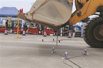 当天进行的实操比赛有3个项目:参赛选手需要驾驶装载机精确击落两个固定区域的乒乓球、精确装载10吨黄沙和倒车入库。比赛主要考量选手对整机的操控能力、机具位置的判断能力。“特别考验选手的操作精准度,位置太高了链条打不到乒乓球,力度大了又会把矿泉水瓶击倒。”比赛现场裁判介绍道。