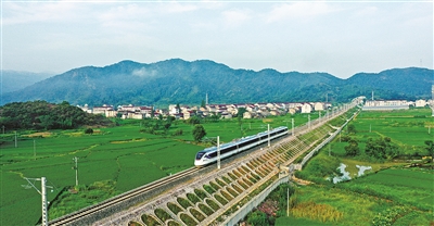 昨日,一辆“和合号”市郊列车在金台铁路仙居县境内铁路上行驶。台州市利用金台铁路台州段开行城市轨道交通线路,既节约投资,又方便了城乡居民出行,实现经济、产业等多方面的全新升级,拉动周边城乡区域的协同发展。