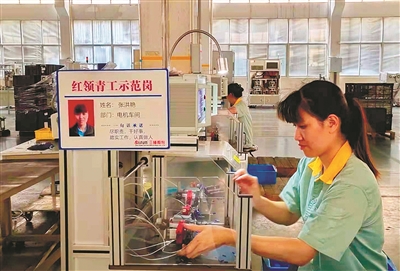 | 红领青工张洪艳正在专心工作。 记者羊荣江 摄 |