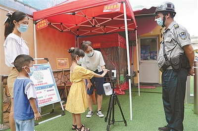 昨日,玉环市龙溪镇星星幼儿园秋季开学开园报名第一天,小朋友们在查过健康码、行程码的父母的陪同下,例行戴口罩、一米线、测体温等防控疫情措施,安全健康入园入学。 通讯员詹智 摄