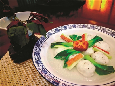 其中紫苏佛手烩鱼圆的思路来自韩国的街头小食,韩国人将鱼肉打成鱼糕,然后加入紫苏叶,手工挤成鱼圆,下油锅煎炸或用火锅煮食。此紫苏鱼圆的做法与韩式鱼圆不同,而是以杭帮菜清汤鱼圆为基础改良而成。原料有鲜紫苏叶、白鲢鱼肉、葱姜水、蛋清、料酒、盐、味精、鲜香橼或鲜佛手片等。