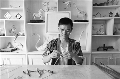 走进周增方的工作室,仿佛踏进新世界的大门,橱柜中展示着形态各异的动物,惟妙惟肖,而制作它们的原材料竟是些不起眼的棕榈叶。