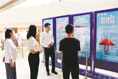 | 公益宣讲员在展板前宣传反诈知识。 |