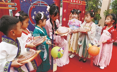 近日,玉环市龙溪镇金色童年幼儿园里,身着汉服的小朋友提着制作的小灯笼,拿着月饼,听老师讲解中秋的来历、习俗,以及嫦娥奔月的故事,尝月饼,传承民俗,开心团圆迎中秋。 通讯员詹智 摄