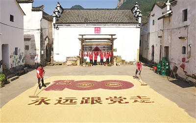 昨日,建德市大慈岩镇党员青年志愿者在上吴方村,利用稻谷、玉米、红辣椒、大蒜等秋季收获的农产品,在古村落晾晒点摆放出“永远跟党走”、喜迎国庆和迎接“2022杭州亚运会”等各种新颖别致的造型图案,表达对党的热爱之情和庆祝丰收的美好新年景。