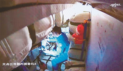 10月17日在北京航天飞行控制中心拍摄的神舟十三号航天员乘组进入天舟三号货运飞船的画面。