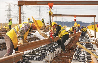 连日来,温州市域铁路S2线一期轨道工程天河站施工现场,建设者们正紧张地进行道床铺设、道岔铺设、无缝线路铺设、轨道附属工程等施工,呈现出一幅热火朝天的大干场面。